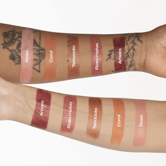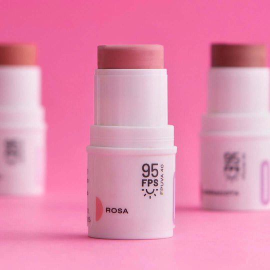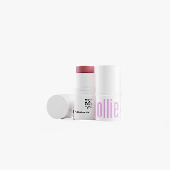 Nosso Ollie em Bastão 3 em 1 FPS 95 é multifuncional e pode ser usado como blush, batom e sombra. Está disponível em 5 cores, sendo 2 com brilho - Terracota e Coral e 3 opacas - Rosa, Rosamalva e Amora.