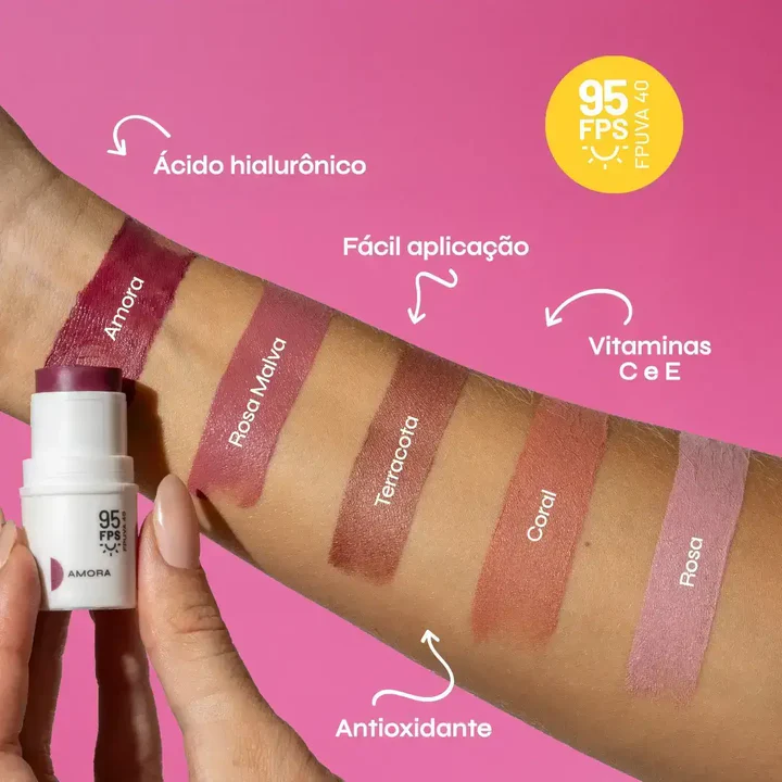 O Protetor Solar com Cor traz FPS 95 com cobertura média de base, enquanto o Bastão 3 em 1 atua como blush, batom e sombra, além de também ter proteção solar. E fica a dica: você pode misturar os tons do Bastão 3 em 1 para criar novas combinações e renovar a make do dia a dia.
